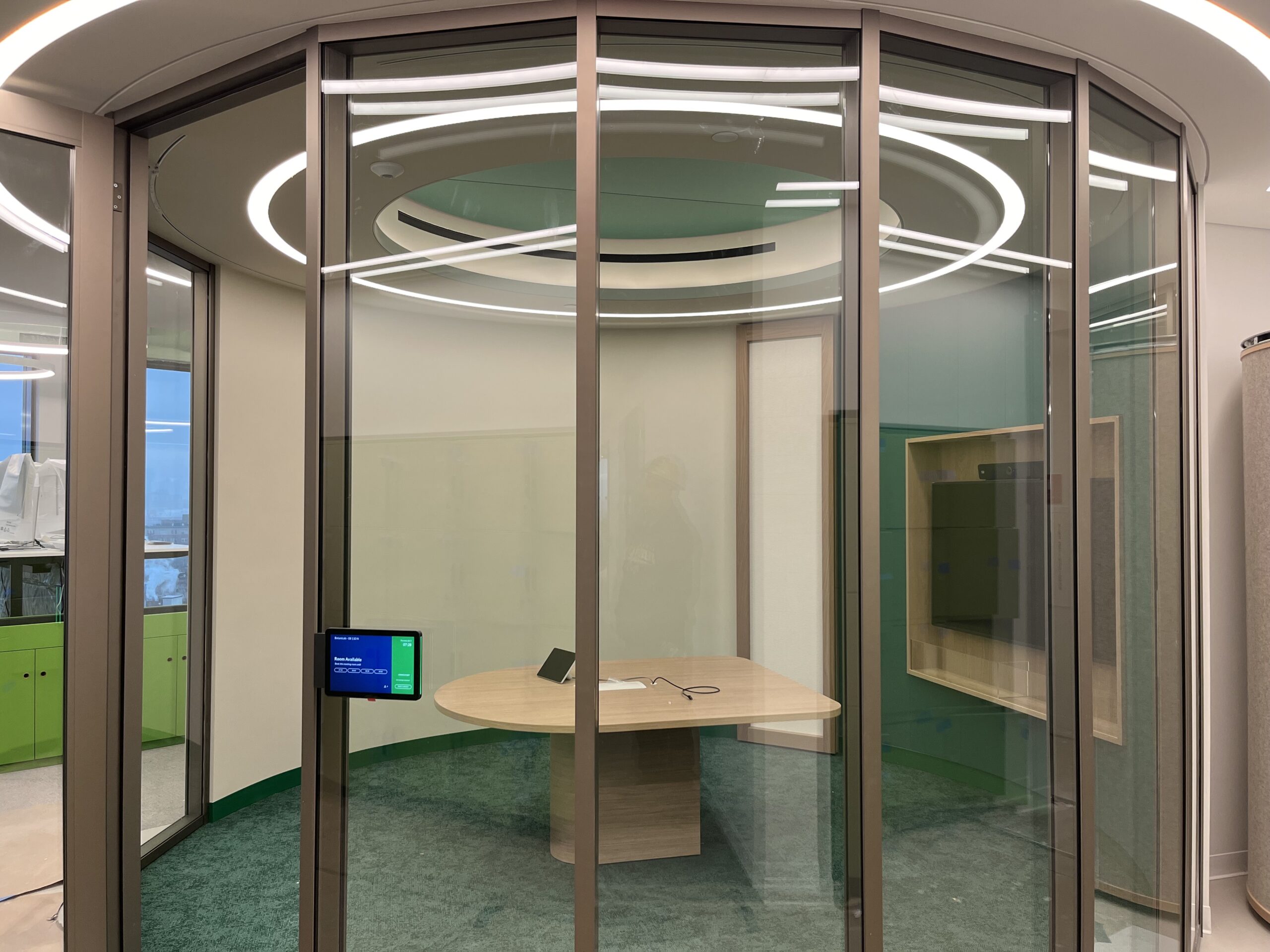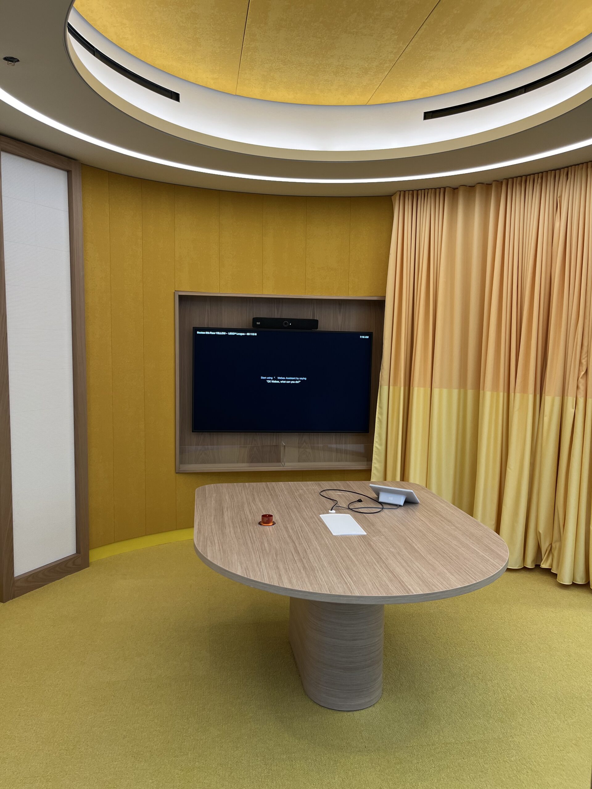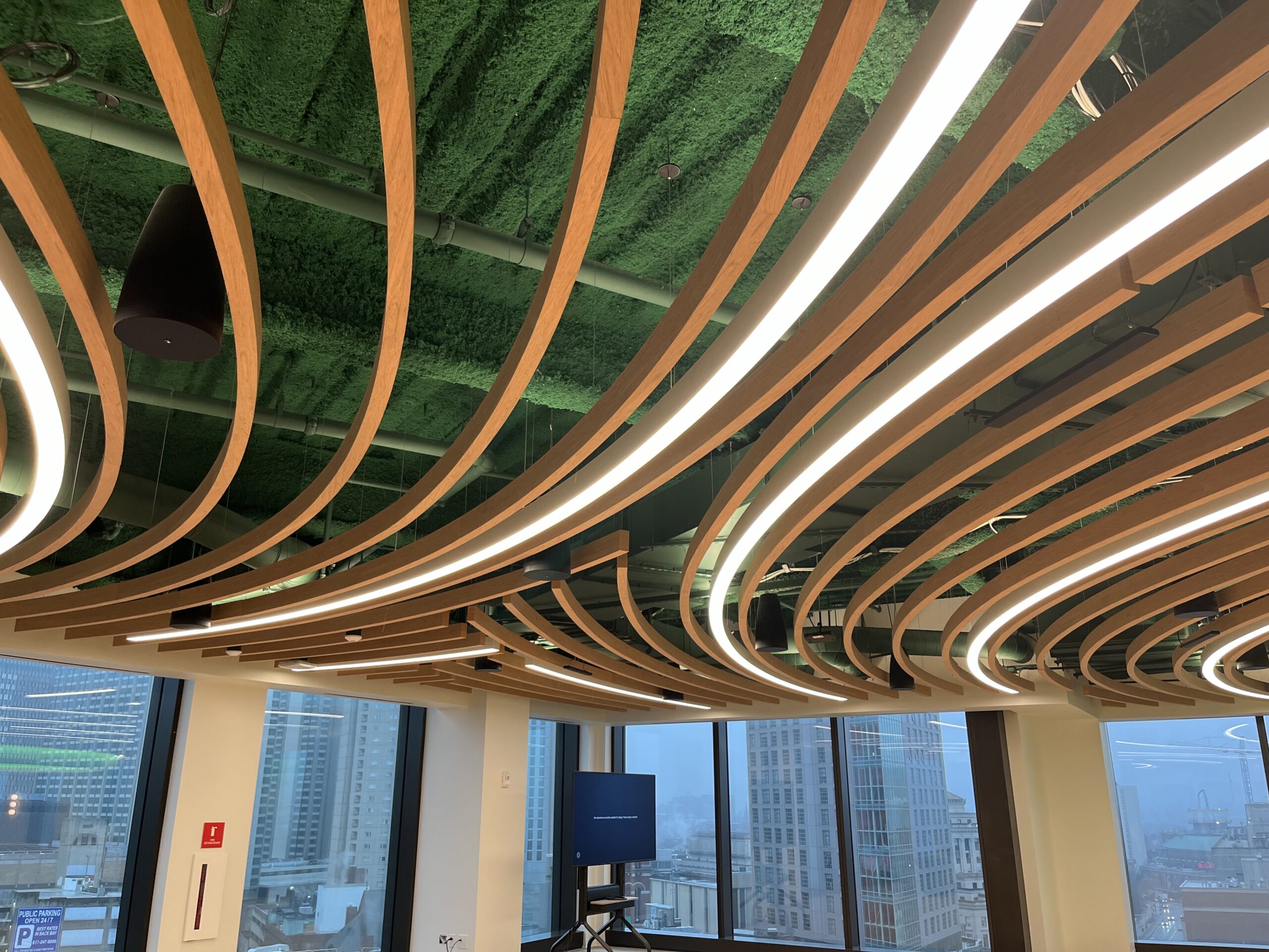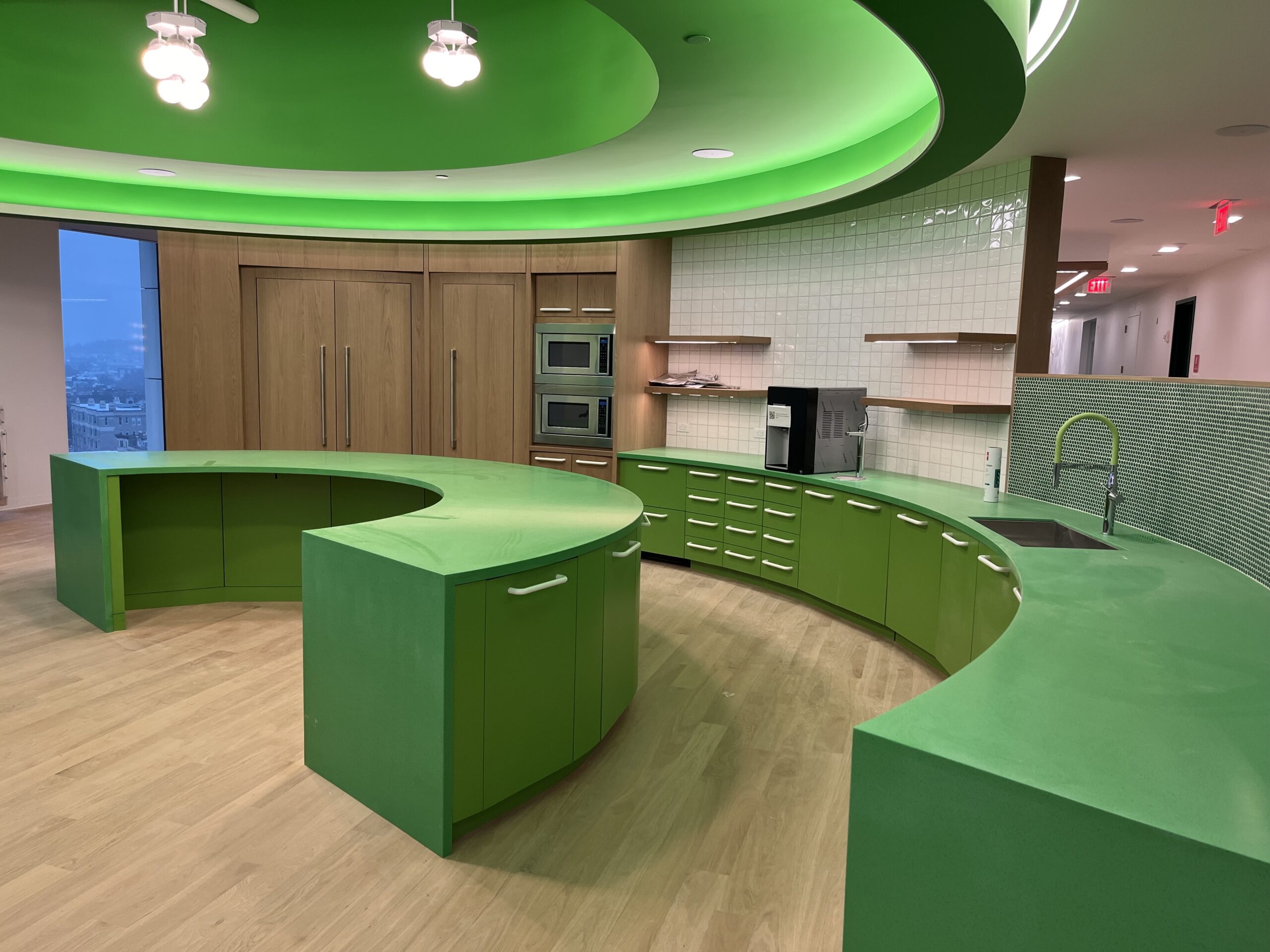 - Curved light fixture were custom measured and fabricated to seamlessly fit the contours of the ceiling